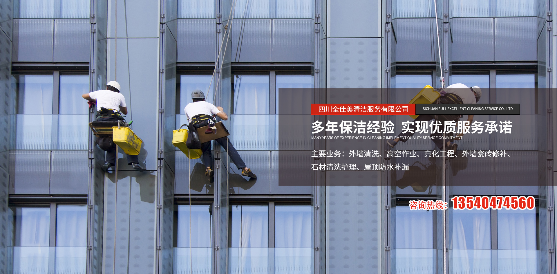 四川全佳美清潔服務有限公司成立于2017年11月20日,注冊資本200萬元人民幣,是一家專業從事高空外墻清洗,外墻維修,開荒保潔,石材養護,外墻防水等一體化的工程服務公司。公司先后服務于成都鐵路培訓學校,雙流空港酒店,省體育館等寫字樓及工業園區的外墻清洗保潔及維修服務。經過多年的發(fā)展與努力,公司已具備一定的規(guī)模及實力。現擁有一支技術精湛的服務團隊,以高標準的服務品質,專業的安全技術實力,為全川不同群體的客戶提供更安全,更周到的清洗服務解決方案,期待與你的合作。